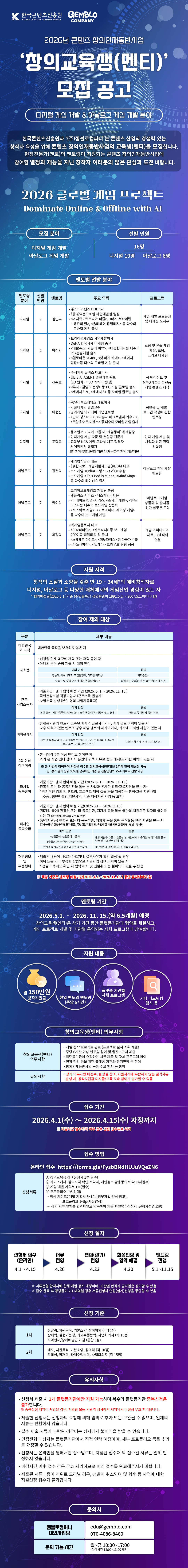한국콘텐츠진흥원에서 주관하는 [2026 콘텐츠 창의인재동반사업] 게임 분야 창의교육생(멘티)를 모집합니다!