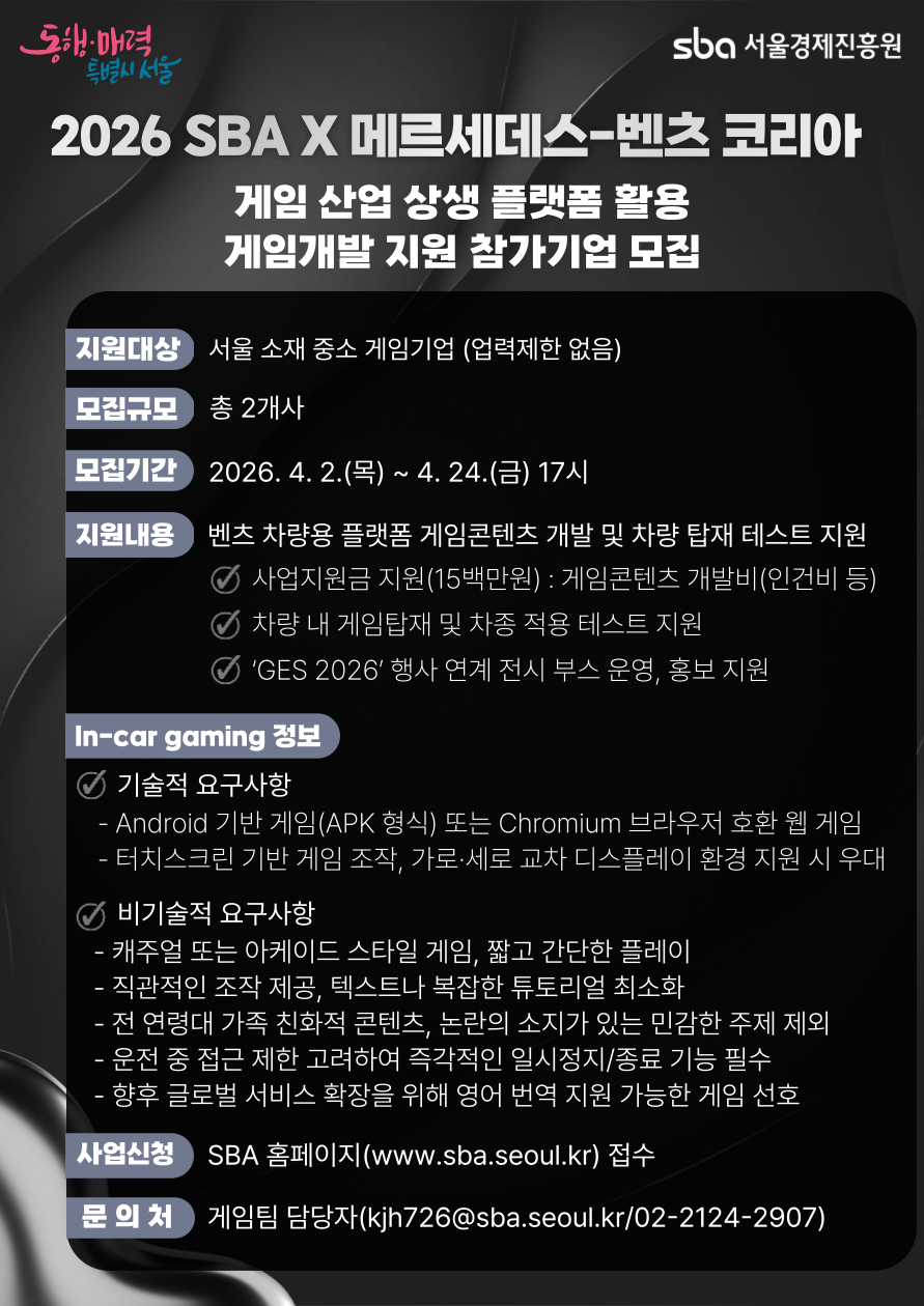 사 업 명: 2026 SBA X 메르세데스-벤츠 코리아(주) 게임 산업 상생 플랫폼 활용 게임개발 지원